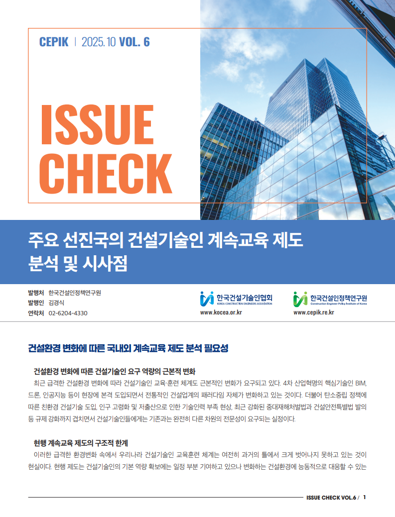 건설기술인 관련 이슈에 대하여 연구·검토·분석하여 정책 제도 등을 제안하는 자료입니다.